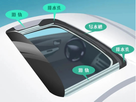 汽车天窗主要是由两条滑轨、两个排水孔和一个导水槽组成,其中滑轨保证天窗的正常滑动,导水槽负责朝着排水孔分流雨水,而排水孔则连接排水管,让雨水能够倒流至前侧轮胎的挡泥板后被排出。