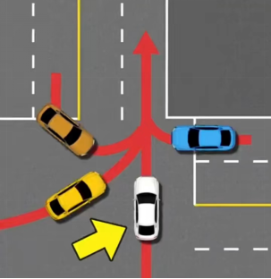 ‌转弯让直行‌:在没有交通信号灯和标志的交叉路口,转弯或调头的车辆应让行直行车辆。例如,蓝色车辆要让黄色车辆先行‌